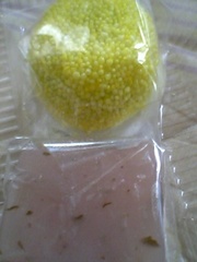 和菓子キタ━(゜∀゜≡゜∀゜)━!!今日のおやつも昨日に引き続き石村萬盛堂(´ω`人)菜の花餅とさくら羹 だよ(●´▽`●)1個55円は安(・∀・)イイ!!