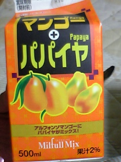 新発売に惹かれて買って貰った“マンゴー+パパイヤ”ジュース!(`∀´)風呂上がりに飲んだら結構イケた♪( ^^)Y☆Y(^^ )よく見ると右端にぶぶたんの耳が━(゜∀゜≡゜∀゜)━!!