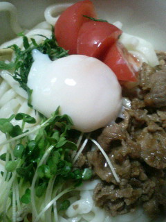 冷やしうどんの温玉のせ━(゜∀゜≡゜∀゜)━!!うまいなぁ、うまいなぁ。タレまで全部いただきました!