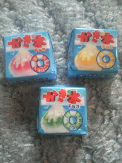 チロルチョコのかき氷がバラで売ってるの発見した━(゜∀゜≡゜∀゜)━!!いちご味、レモン味、まっ茶味、小さいサイズだから1コ10円だった!