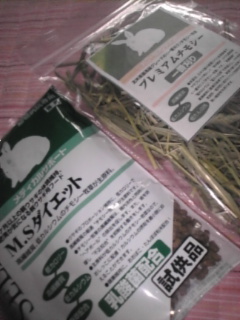 気になっていたペレット(ご飯)と牧草のサンプルを貰った!ぶぶたんは好き嫌いが激しいから、容易に切り替えが出来ないの。だから食べるか食べないかいっつも賭けなんだよ…。