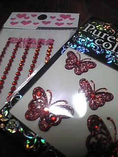 デコ電するために買ったのに赤のキラキラはシールじゃなかった…。_/ ̄|○ガッカリ!!ボンドで貼るタイプだから面倒臭くて使えない!