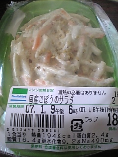 ファミリーマートのごぼうのサラダうめえぇぇ──ヽ(゜∀ヽ(゜∀゜)ノ∀゜)ノ──!通勤途中はファミリーマートしかないからどうしてもファミリーマートのものしか物色出来ないんだけど、これは去年からハマッててわざわざ買いに行くほど好き!(゜▽゜)
