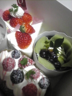 お父さんが昨日ケーキ買ってくるの忘れたから、今日いただきました!ぶぶたんは食べれないけど、わざわざ私に電話してきて「どんなケーキがいいかぶぶたんに聞かないと」と代わってくれとか言うんだよー。もちろん冗談だけど!笑