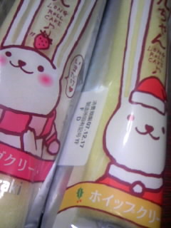 ロールちゃん━(゜∀゜≡゜∀゜)━♪季節限定のイチゴクリームとホイップクリームを買ってきた!(チョコクリームは苦手だから買わなかった)明日の朝食べようっと☆よく見たらホイップクリームはクリスマスVer.だ♪うさぎ可愛いなー。