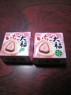いちご大福のチロルチョコが単品で売ってた━(゜∀゜≡゜∀゜)━!!大福というだけあって、ちゃんとあんこの味がするんだよ!すごいよね!でもこの20円サイズよりパックで売られている10円サイズのほうが美味しく思えるのは気のせいかしら??