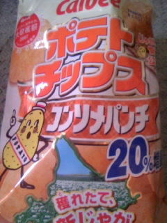 ポテトチップスコンソメパンチ━━(^_-)db(-_^)━━!ポテトチップスはうすしおよりもコンソメパンチ派だよ♪でもうすしおの方が売れてるんだけどね(;^ω^)(^ω^;)